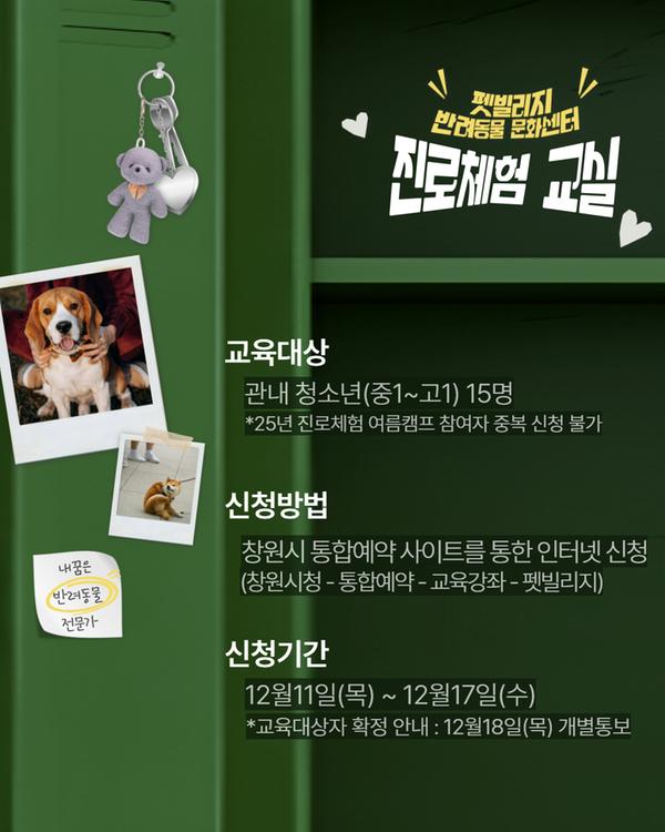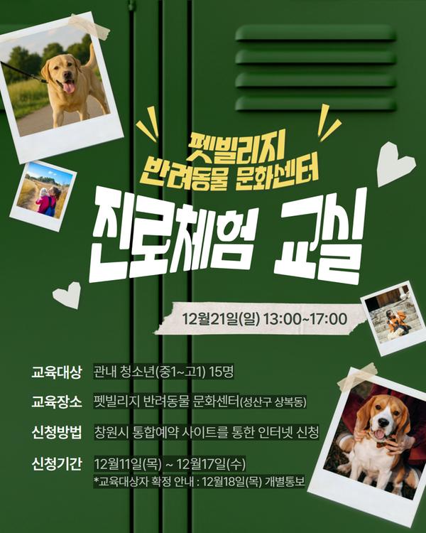 창원 관내 청소년을 대상으로, 펫빌리지가 준비한 반려동물 관련 진로체험 교육 프로그램 ‘창원 진로체험 교실’은 반려동물 산업에 관심이 있는 학생들에게 다양한 진로 가능성을 제시하고, 실제로 현장 실습을 통해 직업에 대한 이해도를 높일 수 있도록 기획되었습니다.