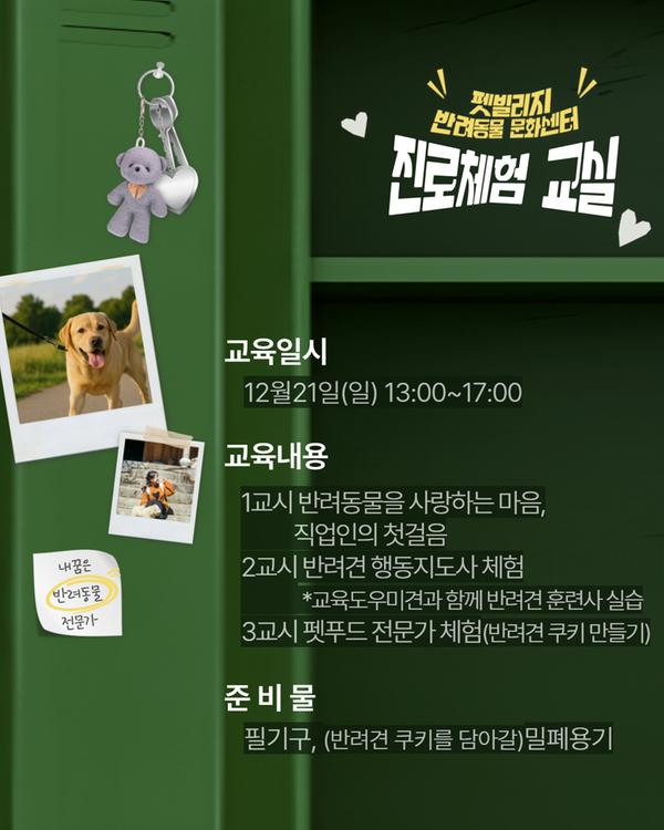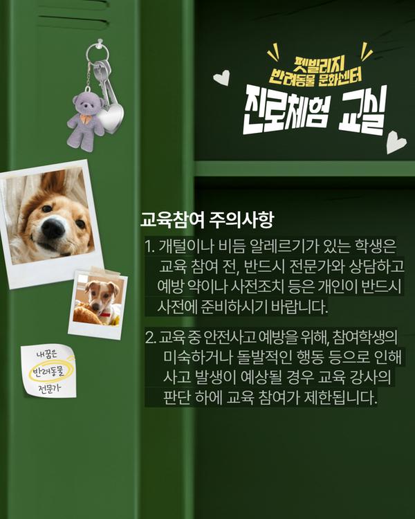 교육에 참가하는 학생들은 반려동물 관련 진로·직업을 탐색하고 직접 체험할 수 있는 기회를 얻게 됩니다. 또한, 동물보호의 중요성과 생명존중의 가치를 배우는 프로그램도 함께 진행되어, 참가 학생들이 올바른 인식을 가지고 성장할 수 있도록 돕고자 합니다.