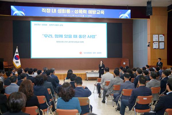 정례조회 종료 후, 간부 공무원을 대상으로 진행된 ‘직장 내 성희롱·성폭력 예방 교육’에서는 부산경찰청에서 경찰관으로 재직중인 강윤진 양성평등 전문강사를 초빙해 ‘우리, 함께 있을 때 좋은 사람’이라는 주제로 고위직 공무원의 책무와 2차 피해 예방을 위한 간부 공무원의 역할에 대한 강의를 이어나갔다.