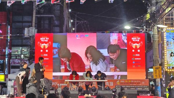 특히 개막 퍼포먼스로 진행된 ‘맥주 건배’는 환호와 웃음 속에 열기를 더하며 본격적인 축제의 시작을 알렸다. 이어서 ‘맥주 빨리 마시기’, ‘맥주캔 쌓기’, ‘도전, 즉석 노래방’, ‘랜덤 댄스 플레이’ 등 시민 참여형 이벤트가 펼쳐지며, 시민들이 직접 무대에 올라 참여하고 응원하는 분위기 속에서 축제의 열기는 더욱 뜨겁게 달아올랐다.