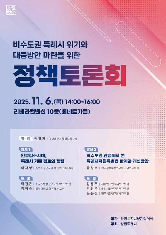 주제 발제는 ▲인구감소시대, 특례시 기준검토와 쟁점(창원시정연구원 사회문화연구실장 이자성) ▲비수도권 관점에서 본 특례시지원특별법 한계와 개선방안(한국정책분석연구원 금창호)순서로 발표 후 토론이 진행된다. 토론 좌장으로는 권경환 교수(경남대학교), 패널로는 이경은 부연구위원(한국지방행정연구원), 김정숙 교수(충북대학교), 김흥주 연구위원(세종연구원), 박진우 연구위원(수원시정연구원), 문동진 연구위원(전주시정연구원)이 참여한다.