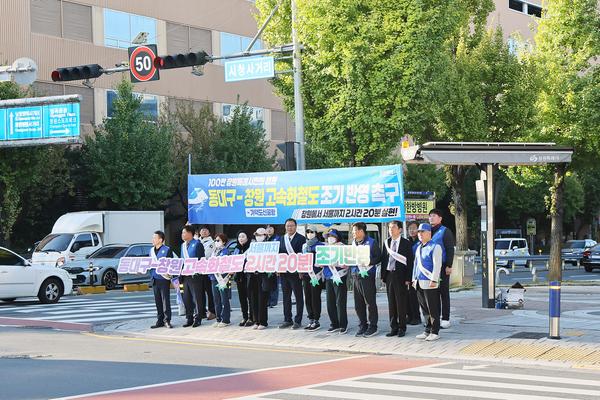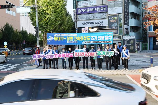 창원특례시는 3일 오전 출근시간대 시청 사거리에서 ‘동대구-창원 고속화철도 조기반영 캠페인 및 범시민 서명운동’을 진행했다.