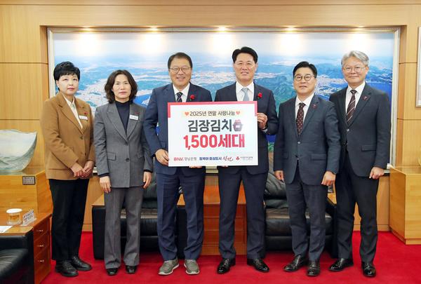 창원특례시는 1일 비엔케이 경남은행(은행장 김태한)이 ‘2025년 연말 사랑나눔 사업’의 일환으로 저소득층의 겨울나기를 돕기 위해 김장김치 1,500박스(6,000만 원 상당)를 기부했다고 밝혔다. 기부된 김장김치는 관내 저소득 가정 1,500세대에 전달될 예정이다.
