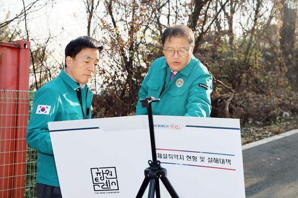 이어 장 권한대행은 겨울철 도로 결빙으로 인한 안전사고 예방과 원활한 교통소통 확보를 위하여 의창구 북면 온천고개 일대 자동염수분사장치 작동 여부 및 제설 장비 확인 등 도로 결빙 및 설해 대책 현장 점검을 실시하였다.