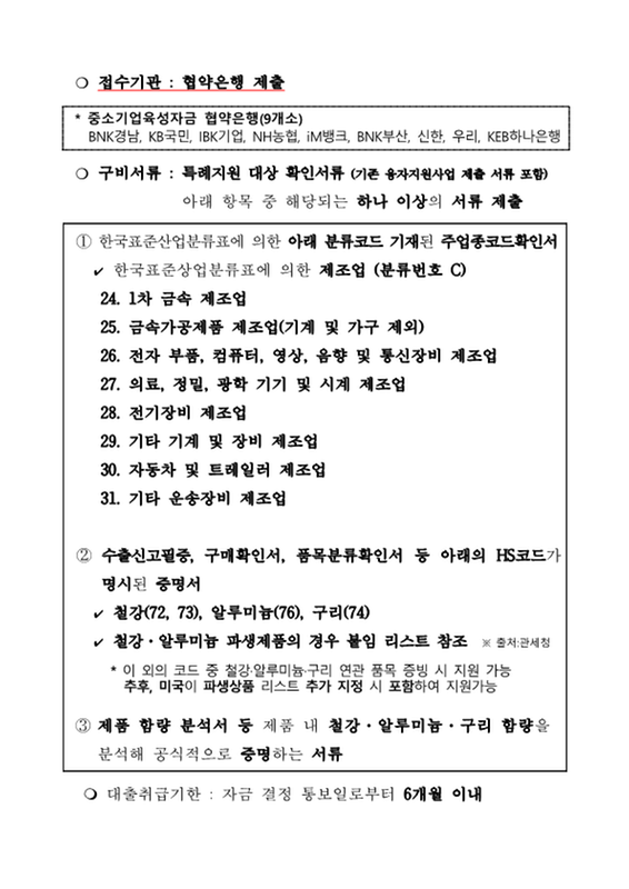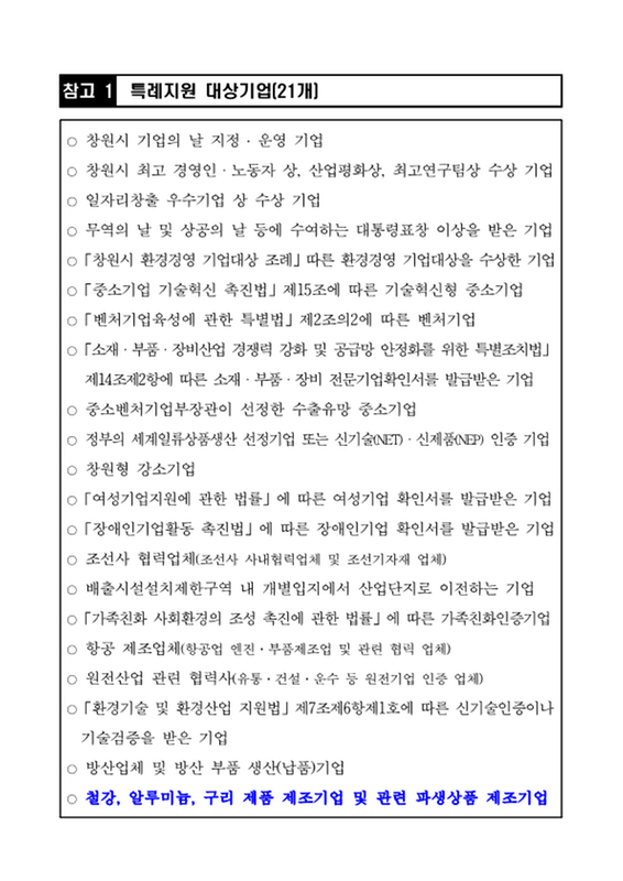 철강・알루미늄 등 관세 부과로 경영난을 겪고 있는 對美 수출 기업에 대한 금융 부담을 해소하고 지속가능한 성장 기반을 마련하기 위해 「창원시 중소기업 육성기금 설치 및 운용 조례」 제13조에 의거, 중소기업육성자금 융자 지원사업의 특례지원 대상기업을 추가 지정 공고 안내입니다.