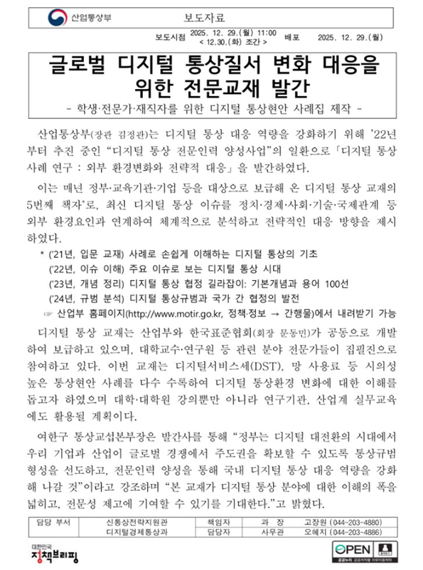 (산업통상자원부 뉴스) 글로벌 디지털 통상질서 변화 대응을 위한 전문교재 발간