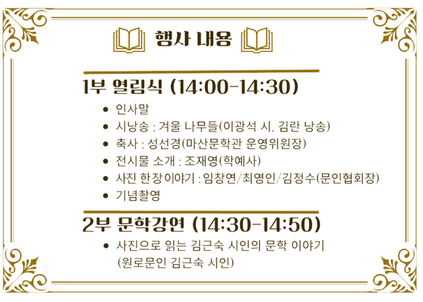 ❍ 주요행사 : 열림식(인사말, 시낭송, 작가 및 전시물 소개, 문학강연, 기타)
