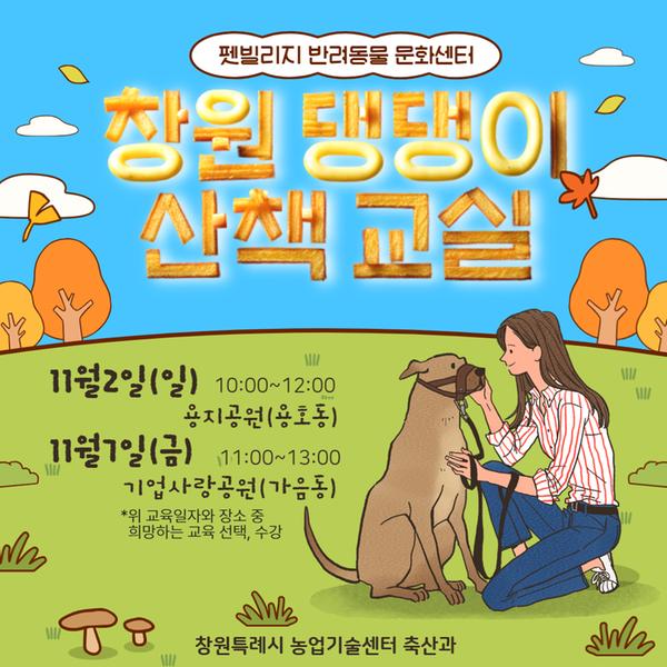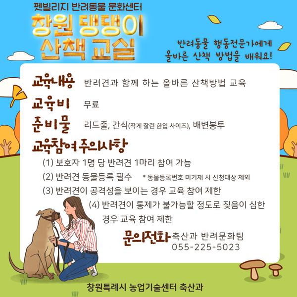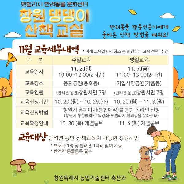 반려견 행동전문가와 함께 창원시 관내 공원 등을 산책하며 올바른 반려견 산책법과 보호자가 산책 시 지켜야 할 사항 등을 배웁니다.