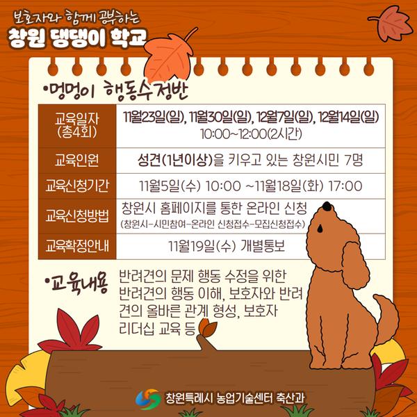 ☞☞ 멍멍이 행동수정반 ☞ https://www.changwon.go.kr/cwportal/10311/10486/10487.web?amode=view&idx=1572