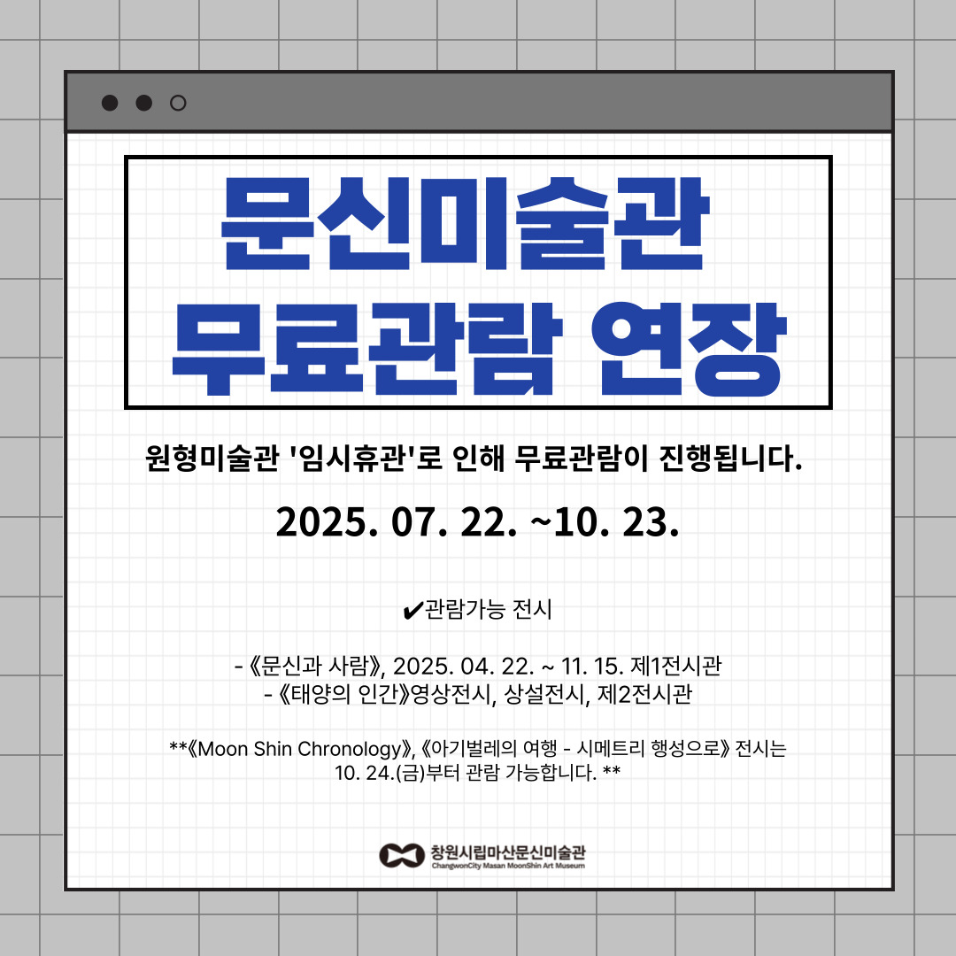 원형미술관 '임시휴관'으로 인해 무료관람이 진행됩니다. 불편을 끼쳐 죄송합니다. 미술관 방문시 참고 부탁드립니다. ✔관람가능 전시 - 《문신과 사람》 2025. 04. 22. ~ 11. 15. 제1전시관 - 《태양의 인간》 영상전시 상설전시, 제2전시관 ✔관람안내 09:00 ~ 18:00 (마지막 입장 17:00) 매주 월요일 휴관 ✔도슨트 운영: 매주 토.일 13:00, 14:00, 15:00, 16:00 (일 4회) ☎ 문의 : 055-225-7181 |