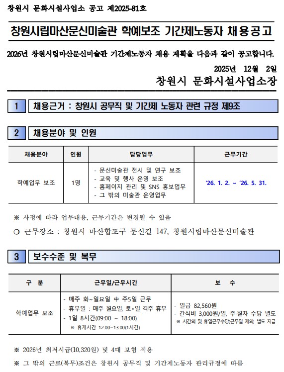 [공지] 창원시립마산문신미술관 학예보조 기간제노동자 채용공고