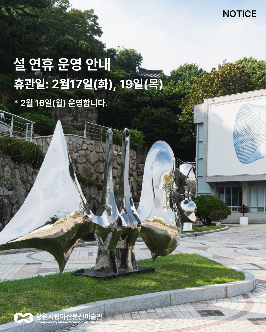 문신미술관은 설 연휴 기간 중 관람 일정이 일부 변경되오니 방문 전 참고 부탁드립니다. ✔ 2월 16일(월) : 정상 운영 ✔ 2월 17일(화) 설날 당일 : 휴관 ✔ 2월 18일(수) : 정상 운영 ✔ 2월 19일(목) : 휴관 ※ 매주 월요일은 정기 휴관일이나, 이번 설 연휴에는 16일(월) 정상 운영합니다. 관람에 착오 없으시길 바라며, 따뜻한 설 연휴 보내시기 바랍니다. ✔전시일정 -《Moon Shin Chronology(문신 연대기)》 2025. 10. 14. ~ 2026. 8. 30. 원형전시관 1관 -《사랑(Deep Affection)》 2025. 12. 16. ~ 2026. 8. 31. 제1전시관 ✔관람안내 09:00 ~ 18:00 (마지막 입장 17:00) ✔도슨트 운영: 매주 토.일 13:00, 14:00, 15:00, 16:00 (일 4회) ☎ 문의 : 055-225-7181 |