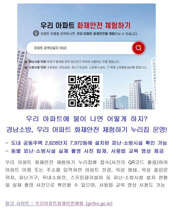 - 내용 : 경상남도 내 아파트 이름 또는 주소를 입력하면 아파트 전경, 피난기구, 옥내소화전, 스프링클러