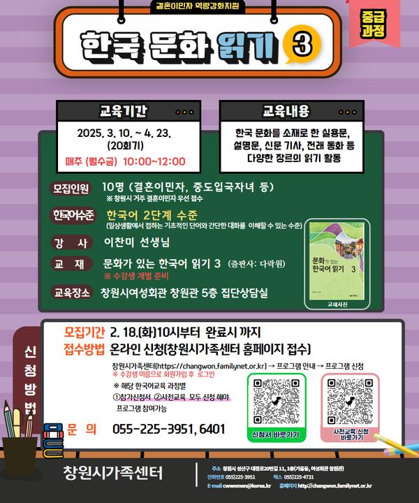 창원시가족센터에서는 다문화가족의 역량강화를 위해 다음과 같이 한국어교육과정을 개설하오니, 많은 관심 부탁드립니다.