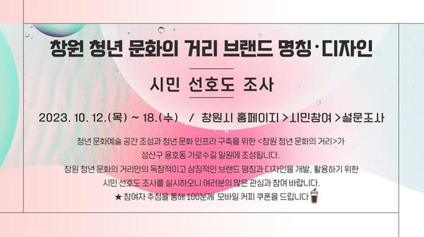 창원특례시(시장 홍남표)가 창원 청년 문화의 거리를 상징하는 브랜드 명칭과 디자인안을 개발하고 시민을 대상으로 선호도 조사를 실시한다고 밝혔다.