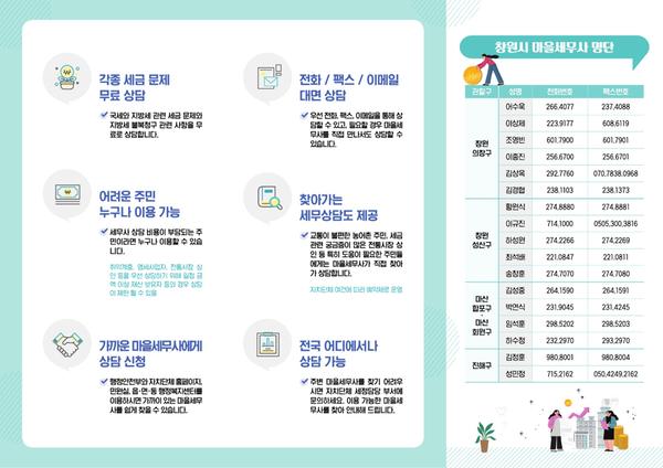 ‘마을세무사’제도란 복잡한 세무행정에 대한 전문지식이 부족하거나 과세불복 관련 비용부담이 어려운 시민들에게 무료(재능기부)로 세무 상담과 권리구제 지원 서비스를 해주는 제도로서 창원시에는 17명의 4기 마을세무사가 지정되어 있다.