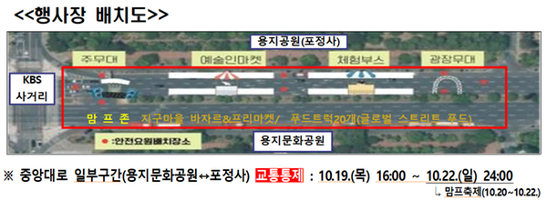 이번 축제장 설치를 위하여 창원 중앙대로 중 KBS사거리-경남신문사사거리가 교통 통제될 예정이다. 교통통제는 19일 오후 4시부터 시작하여 22일 자정까지이다.