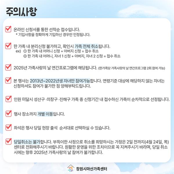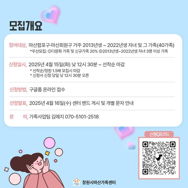 - 참여대상: 마산합포구 마산회원구 거주 2013년생~2022년생 자녀 및 그 가족(40가족)