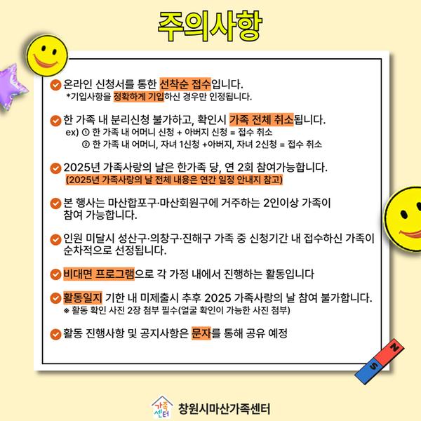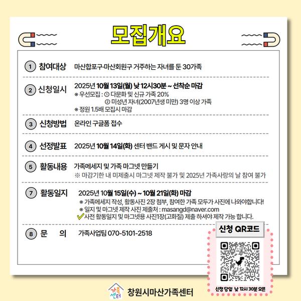 창원시마산가족센터에서는 2025년 “가족사랑의 날-가족 마그넷 만들기” 참여 가족을 모집합니다.