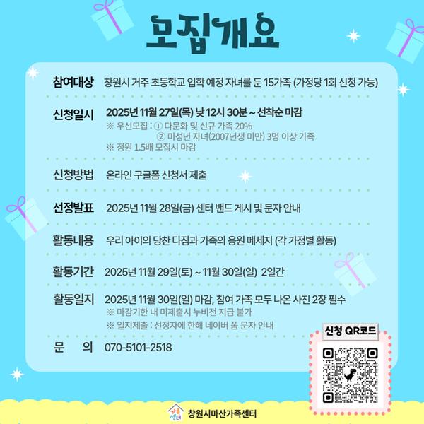 - 선정안내: 2025년 11월 28일(금) 창원시마산가족센터 밴드 게시 및 문자 안내