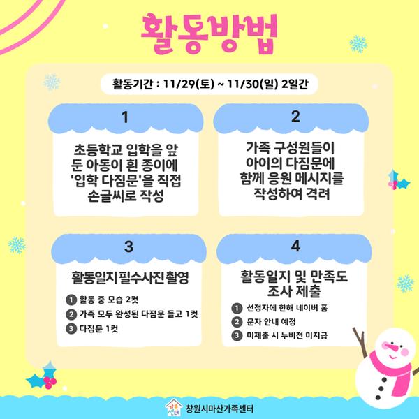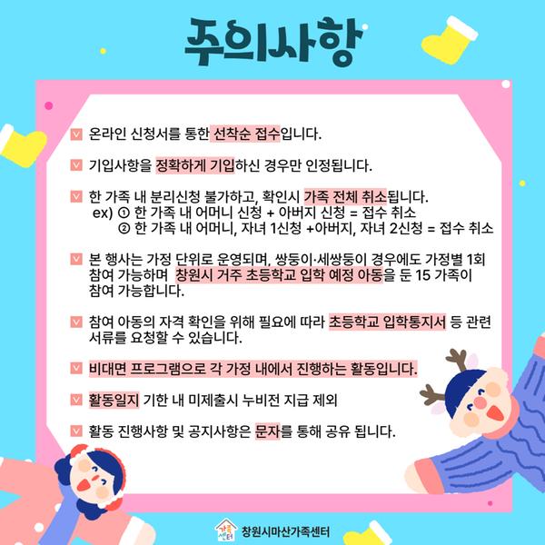 - 참여대상: 창원시 거주 초등학교 입학 예정 자녀를 둔 15가족(가정당 1회 신청 가능)
