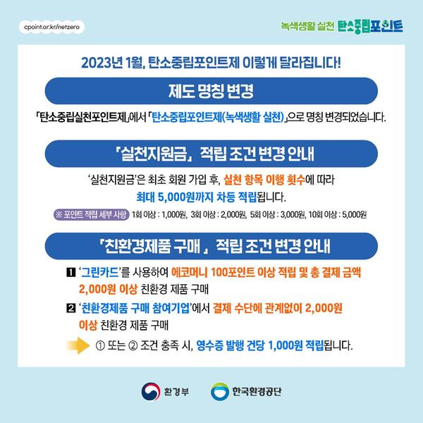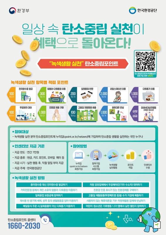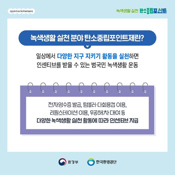 탄소중립 생활 실천문화 확산을 위하여 시민의 일상 속 탄소중립 실천활동에 인센티브를 제공하는 "탄소중립포인트제 녹색생활실천분야"를 다음과 같이 홍보하오니 협조하여주시기 바랍니다.