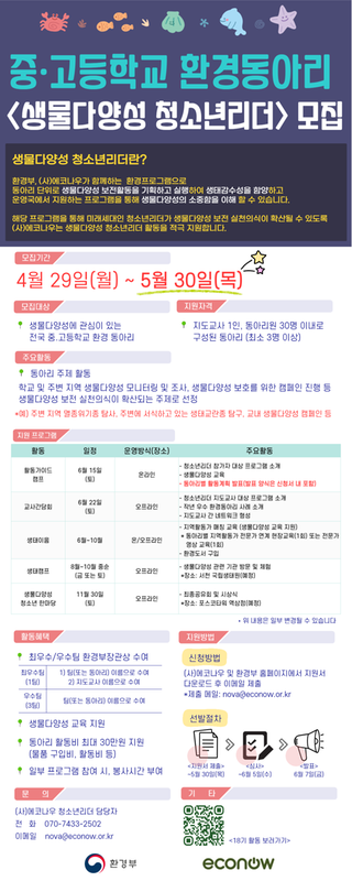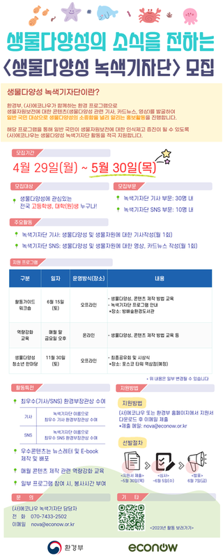 이와 관련하여, 「2024년 생물다양성 청소년리더 및 녹색기자단」을 2024. 5. 30.(목)까지 아래와 같이 모집 안내합니다.