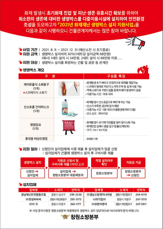 재난·사고로부터 안전한 창원시를 만들기 위한 사업으로 화재 발생시 초기화재 진압 및 피난·생존 유효시간 확보를 위하여 최소한의 생존에 대비한 생명박스를 다중이용시설에 설치하여 안전환경 조성을 도모하고자 「2021년 화재재난 생명박스 설치 지원사업」을 다음과 같이 시행하오니 건물관계자께서는 많은 참여 바랍니다.
