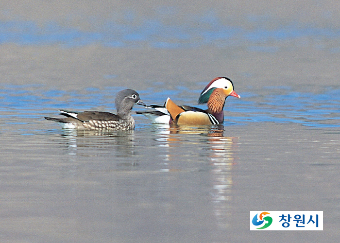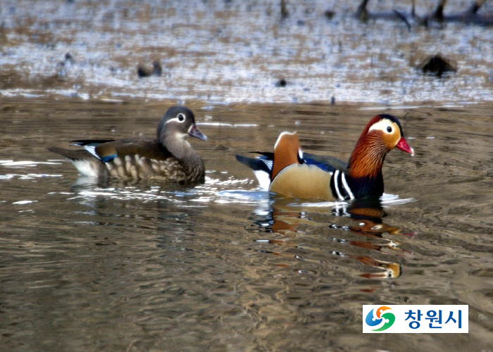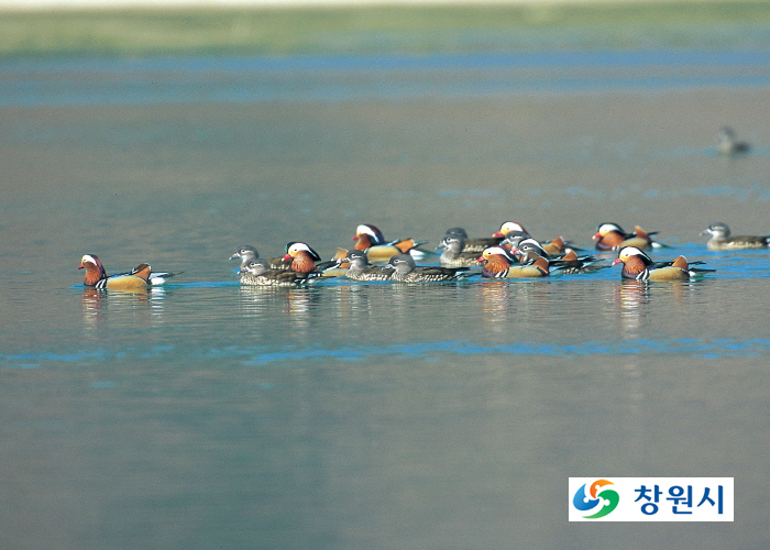 원앙은 산림이 울창한 계곡에서 번식하는 흔하지 않은 겨울 철새이자 텃새다. 겨울에는 북쪽에서 남하해 오는 무리들이 있어서 거제도, 진주 남강, 주남저수지 등 남부지방에서 쉽게 볼 수 있다, 10월 초에는 주남저수지 가운데 갈대숲 근처에서 가끔 적은 무리를 확인할 수 있다. 몸길이는 45cm이며, 수컷은 머리와 가슴이 진한 갈색이고 가슴에 세로줄이 있다. 머리 뒤쪽의 깃털은 관우상(冠羽狀)으로 되어 있으며 부채 모양의 날개깃이 있다. 부리는 붉은색이며 끝은 흰색이다. 암컷은 갈색을 띤 회색의 얼룩무늬가 있고 가는 눈선은 흰색이며 가슴과 옆구리에 흰 점이 있다. 주로 나무 구멍에 둥지를 트는 화려한 오리다. 풀씨, 도토리, 달팽이, 민물고기, 곤충류 등을 먹는다. 천연기념물 제 327호로 지정하여 보호하고 있다.