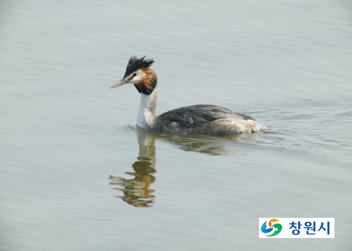 뿔논병아리는 저수지, 하구, 강, 해안 등에서 흔하게 생활하는 겨울 철새이자 텃새다. 주남저수지에서는 적은 수의 개체를 확인할 수 있다. 몸길이는 49cm이며 논병아리류 중에서 덩치가 제일 크다. 머리에는 검은색 뿔깃이 있고 긴 목이 특징이다. 겨울철에는 얼굴과 앞목은 흰색이며 부리는 분홍색이다. 여름철에는 귀깃이 적갈색이며, 머리와 목의 경계 부분은 검은색이다. 어류, 양서류, 수생곤충, 연체동물 등을 먹는다.