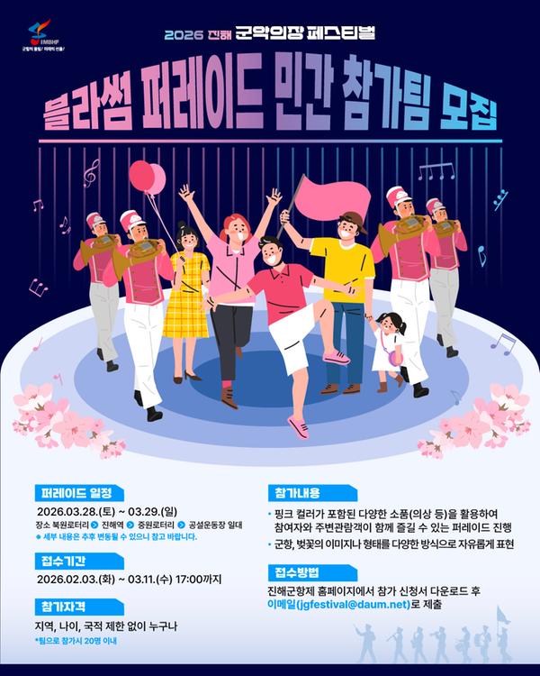 [홈페이지(www.jgfestival.or.kr)>공지사항> 2026 진해군항의장페스티벌 『블라썸 퍼레이드』민간 참가팀 모집공고]
