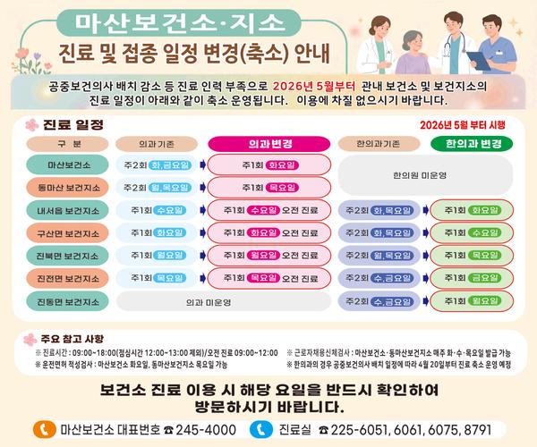 공중보건의 배치 감소 등 진료 인력 부족으로 2026년 5월부터 관내 보건소 및 보건지소의 진료가 축소 운영 됩니다.