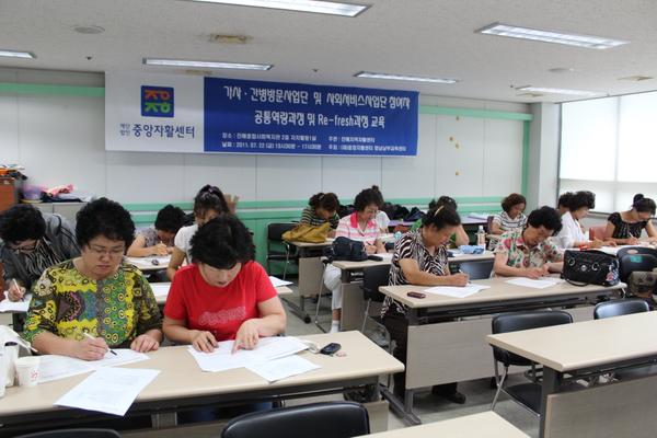 지난 7월 22일 진해지역자활센터 사회서비스 참여자들은 CS교육을 통하여 참여자 본인들 스스로가 평상시 서비스 이용자들에게 제공해왔던 서비스의 내용들을 점검해 보고, 이용자들과의 관계에 있어 좀 더 요양보호사로써의 전문적인 자세의 필요성을 깨닫는 의미 있는 시간을 가져보았다.또한, CS교육에 이어 진행되었던 마사지교육 시간에는 사전에 미리 참여자들 스스로가 필요한 도구들(수건, 오일)을 직접 준비해오는 적극성을 보였으며, 두 사람씩 짝을 이루어 서로에게 수업내용을 적용해 보는 등 이론보다는 실기위주로 교육을 진행 하였다.오전근무를 하고 오후시간에 이어진 교육이라 더위와 피곤함에 조금은 지쳐있는 시간에 업무로 인한 스트레스와 피로를 참여자들 스스로가 함께 풀어보는 재충전의 시간 이였다.