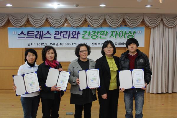 진해지역자활센터 에서는 지난 2012년 2월 24일에 기관 참여자 월례회를 가졌다.이날 월례회는 지역 내의 유관 기관(진해보건소, 연세사랑병원)과의 연계를 통해 정신건강(우울증 및 스트레스 극복)을 목적으로 한,『스트레스 관리와 건강한 자아상』이라는 제목으로 교육을 실시하였으며, 외부시상 및 장학금 전달식도 가졌다.외부시상은 경상남도지사로부터 받은 자활.자립상(쿠키데이 참여자 박**)과 경남사회적기업 협의회에서 후원하는 장학금 지원(해피푸드 참여자 자녀)이 있었다.청소년자활지원관에서 연계하는 2012년 장학금지원사업은 대학진학 장학금 4명, 고등학교 진학 교복비 지원 1명이 있었다.