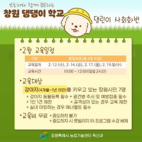 * 댕린이 사회화반(평일과정) 신청 → https://www.changwon.go.kr/cwportal/10311/10486/10487.web?amode=view&idx=1244