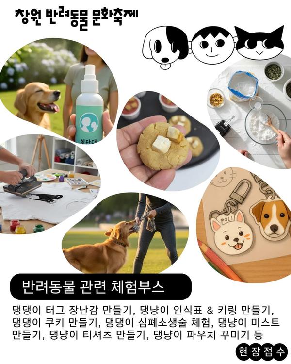 __- 반려동물 관련 체험 부스(댕댕이 쿠키 만들기, 댕댕이 터그 장난감 만들기, 댕냥이 인식표 & 키링 만들기, 댕댕이 심폐소생술 체험, 댕냥이 미스트 만들기, 야옹이 모래 탈취 파우더 만들기, 야옹이 모빌 만들기 등)