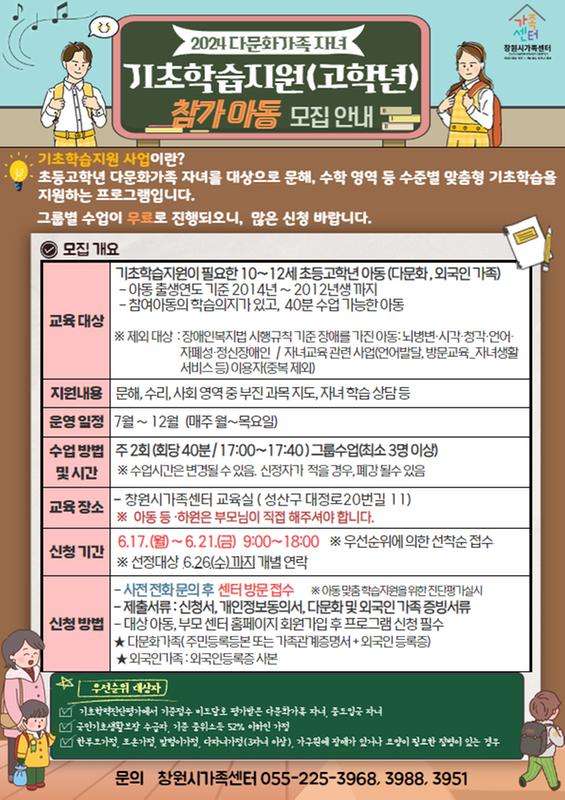 다문화가족 자녀 대상 문해·수리·사회 영역 기초학습을 지원하는 「2024 다문화가족 자녀 기초학습지원(고학년)」 참가자를 다음과 같이 모집하오니 많은 참여 바랍니다.