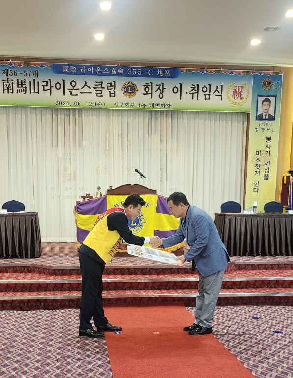 창원특례시 마산합포구 자산동행정복지센터(동장 이지영)에서는 12일 국제라이온스협회 355-C지구 라이온스회관에서 남마산 라이온스클럽(이임회장 박경우, 취임회장 김광혁) 이·취임식 때 지역내 어려운 이웃을 위해 써달라며 자산인심 나눔냉장고용 물품 300만원 상당을 기탁했다고 밝혔다.