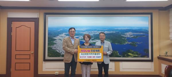 위기가구 식료품 세트 기탁 사진1(왼쪽부터 이마트 마산점 점장 김도완, 마산희망지역자활센터장 최미혜, 강창열 마산합포구청장, 배기철 사회복지과장)