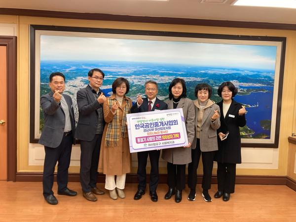 전달사진(왼쪽에서 여섯 번째 마산합포구지회 지회장 이가진 및 임원일동)