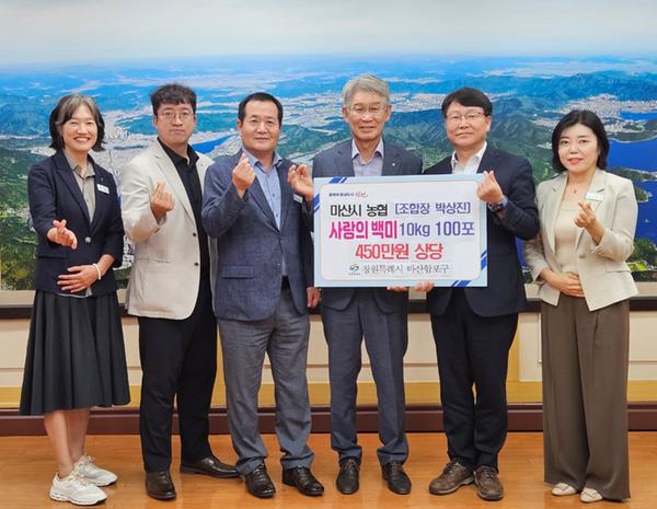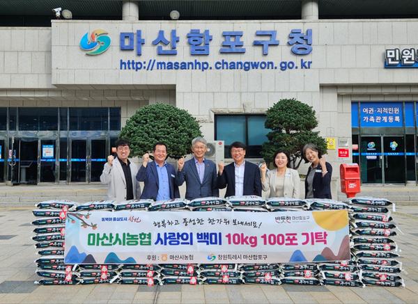 창원특례시 마산합포구(구청장 서호관)는 16일(화), 마산시농협(조합장 박상진)에서 다가오는 추석 명절을 맞아 백미(10kg) 100포(450만원 상당)를 기탁했다고 밝혔다.