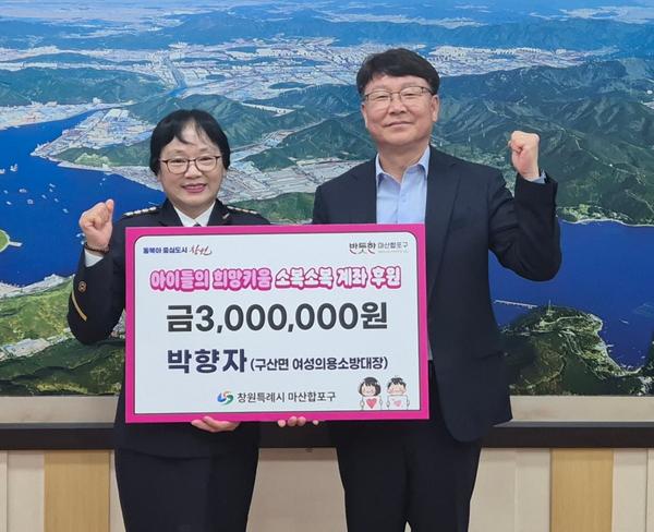 창원특례시 마산합포구(구청장 서호관)는 24일(수), 마산합포구 구산면 박향자 여성의용소방대장이 지역의 어려운 아동들을 위해 성금 300만원을 기탁했다고 밝혔다.