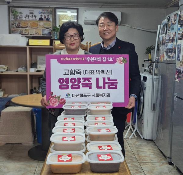 창원특례시 마산합포구(구청장 서호관)는 17일(수), 문화동 소재 고향죽(대표 박희선)에서 지역 내 홀몸가구를 위해 영양죽 30개(24만원 상당)를 전달했다고 밝혔다.