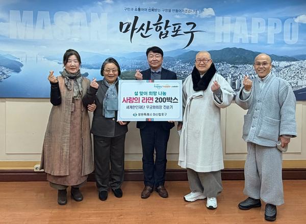 기탁사진(왼쪽부터 네 번째 진순기 회장, 서호관 구청장, 김해 금강사 법장스님 등)