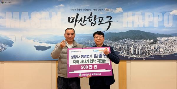 창원특례시 마산합포구(구청장 서호관)는 25일, 청량사 청명법사가 구청 접견실을 방문해 저소득 세대 신입생 가구를 위한 입학지원금 500만 원을 전달했다고 밝혔다.