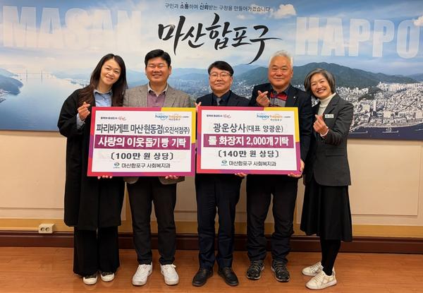 창원특례시 마산합포구(구청장 서호관)는 17일, 광운상사(대표 양광운)와 파리바게뜨 마산현동점(대표 오진석)에서 지역 취약계층을 위해 두루마리휴지 2,000개(140만원 상당)와 빵 500개(100만원 상당)를 기탁했다고 밝혔다.