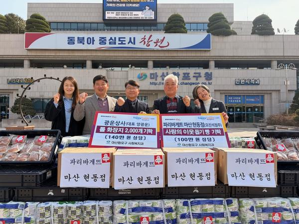 이 날 기탁식에는 서호관 마산합포구청장, 양광운 광운상사 대표, 오진석 파리바게뜨 마산현동점 대표 등이 참석해 나눔의 의미를 함께 하는 뜻깊은 시간을 가졌다.