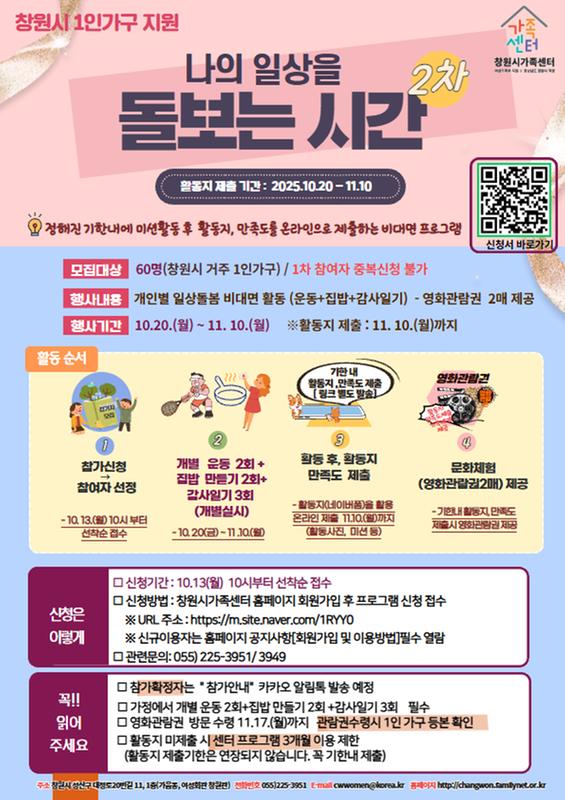 창원시가족센터 ‘슬기로운 1인생활’ 참가자 모집 안내