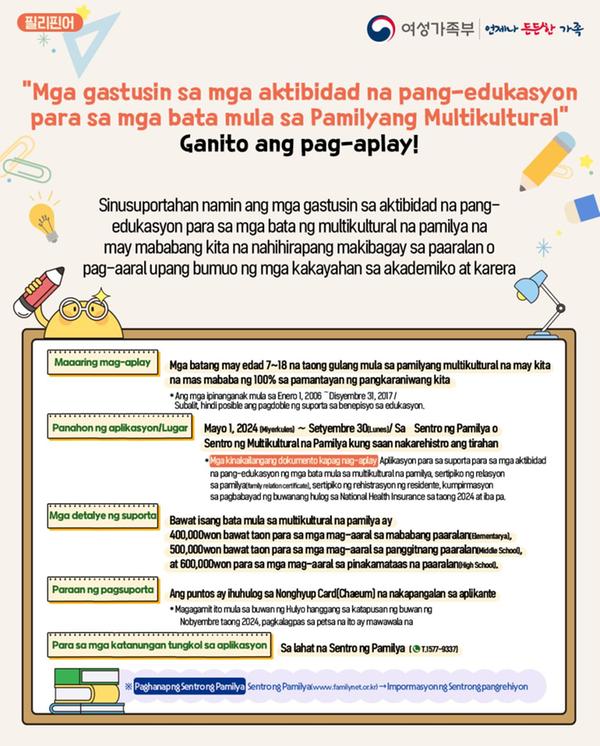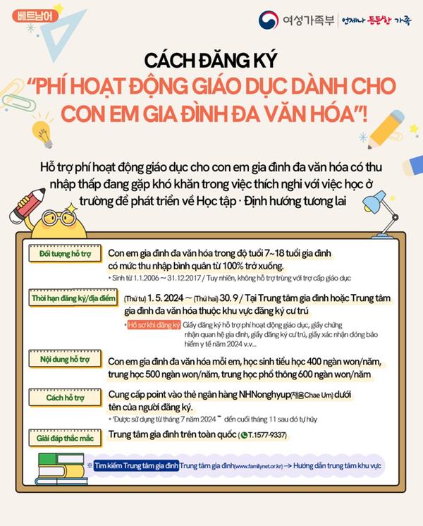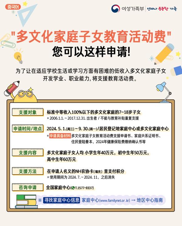 창원시에서는 저소득 다문화가족 자녀의 학습 격차 해소 및 학업 지속 기반 마련을 위해 '다문화가족 자녀 교육활동비 지원사업' 대상자를 다음과 같이 모집하오니 대상자 여러분의 많은 참여 바랍니다.
