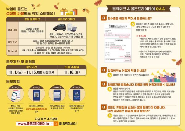 창원시 관내 소상공인 업체에서 1만원 이상 결제한 영수증 촬영 -> QR코드 스캔 또는 www.골든프라이데이.kr 접속 -> 개인정보제공동의 및 영수증 업로드 -> 응모완료 메세지가 오면 끝!